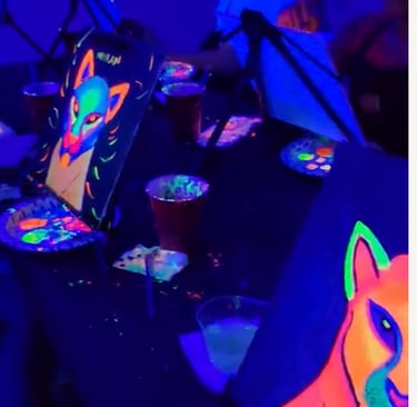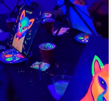 Unique Glow-in-the-Dark Theme: Painting in the dark with glowing colors adds a magical twist to the traditional sip and paint experience.